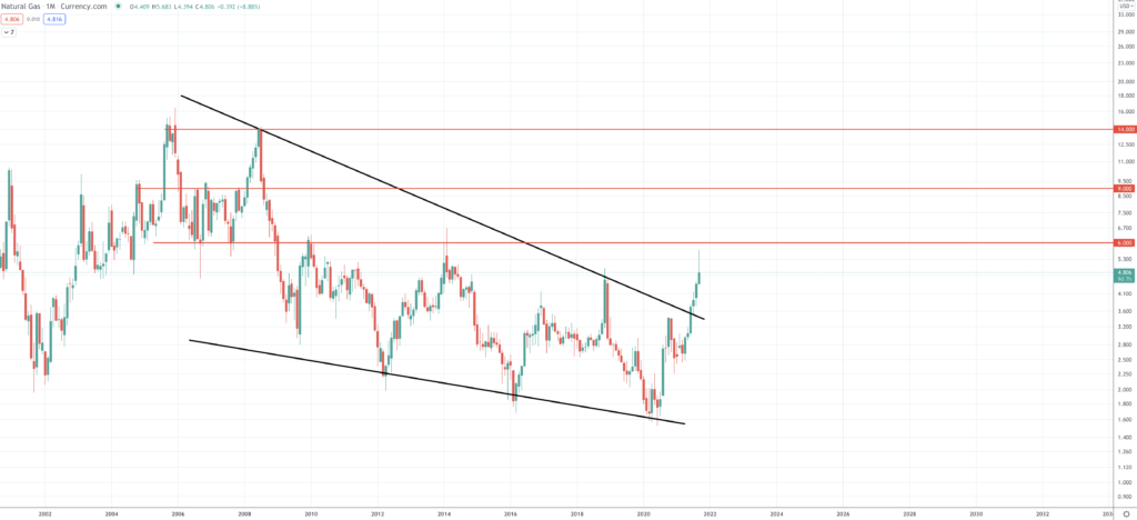 In the short term, Natural Gas prices could see an attempt to retest the $6-9 range, following a breakout of downtrend resistance. If it can get above, there’s a chance the asset runs to $14 and former highs.